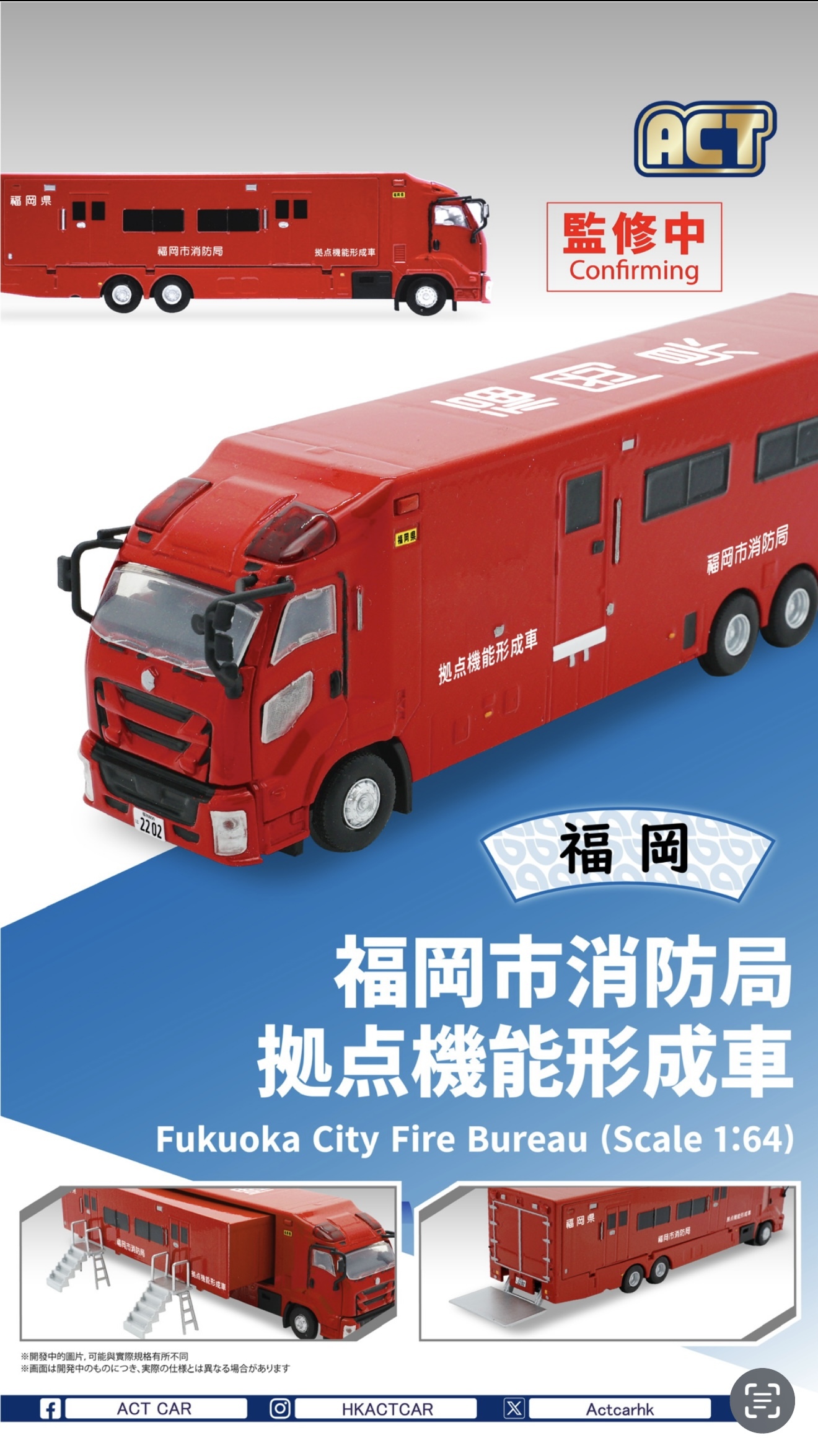 福岡市消防局消防局拠点機能形成車 1/64比例 壓鑄,限量生產500個,車身長18 cm 車身活動部件可打開 ! 駕駛座上有一個消防員員模型。